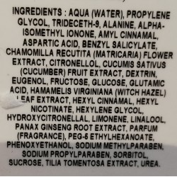 INCI: Aqua (Water), Potassium Myristate, Glycerin, Potassium Laurate, Myristic Acid, Cera Alba (Beeswax), Glyceryl Stearate SE, Sodium Methyl Cocoyl Taurate, Lauric Acid, PEG-30 Glyceryl Stearate, Sodium Lauroyl Sarcosinate, PEG-150 Distearate, Polyglyceryl-3 Oleate, Poloxamer 407, Jojoba Esters, Ethylhexylglycerin, Dimethicone, Polysorbate 65, Glyceryl Stearate, Simethicone, Methylcellulose, Sulfuric Acid, Tocopherol, Lecithin, Ascorbyl Palmitate, Glyceryl Oleate, Citric Acid, Phenoxyethanol, Sorbic Acid, Benzyl Salicylate, Linalool, Hexyl Cinnamal, Alpha-Isomethyl Ionone, Citronellol, Parfum (Fragrance), CI 77288 (Chromium Oxide Greens)